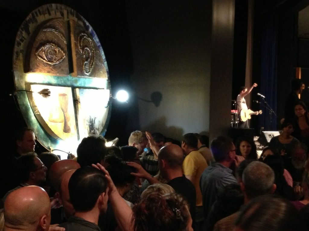 On the first night, we began our live art by bringing out two mysteriously shrouded quadrants of a circle. Each quadrant was a thick canvas that was actually a quarter-circe 2 feet across. Our team began by scraping and pulling away scales, rags, and dirty debris that shrouded each canvas to reveal a sculpted eye and a sculpted ear that we’d already made ahead of the conference, in clay-colored bas relief. In this action, our artists were visually asking The Lord to open our eyes and ears, to give whatever the Lord wanted to give each person at the conference. On this first night, we saw an amazing physical healing surrounding this piece of art that I will tell you about in another post.